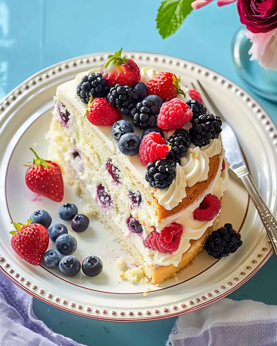 Moreover, the cake’s light and airy texture will leave your guests in awe. Featuring layers of fluffy vanilla cake paired with a rich yet delicate whipped cream—infused with a hint of vanilla and almond extract—it practically melts in your mouth. And let’s not forget the berries that burst with flavor, adding vibrant color to your dessert spread. It’s a showstopper, ideal for birthdays, brunches, or even a casual weeknight treat.