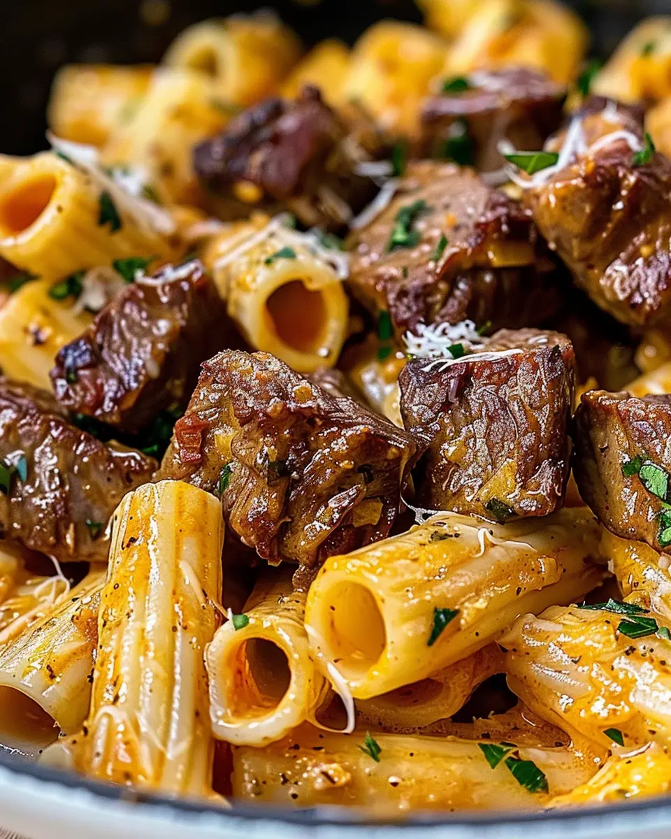 PrintCajun Steak Tips in Cheesy Rigatoni Parmesan Sauce: A Comforting Delight