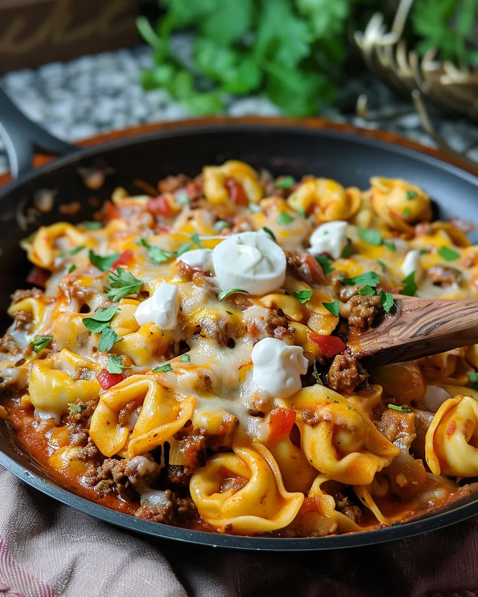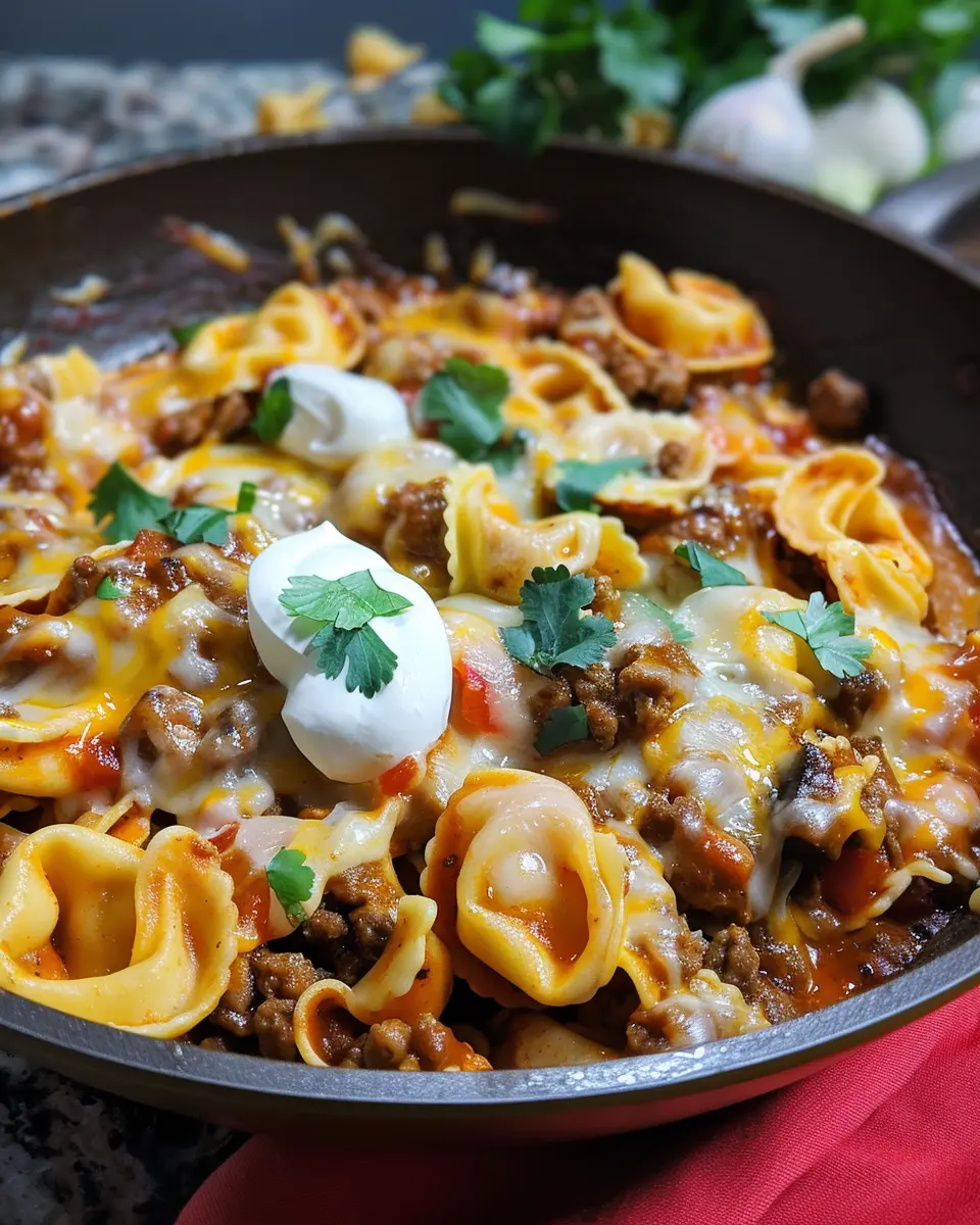 A delightful skillet dish combining cheesy beef, enchiladas, and tortellini for a quick meal.