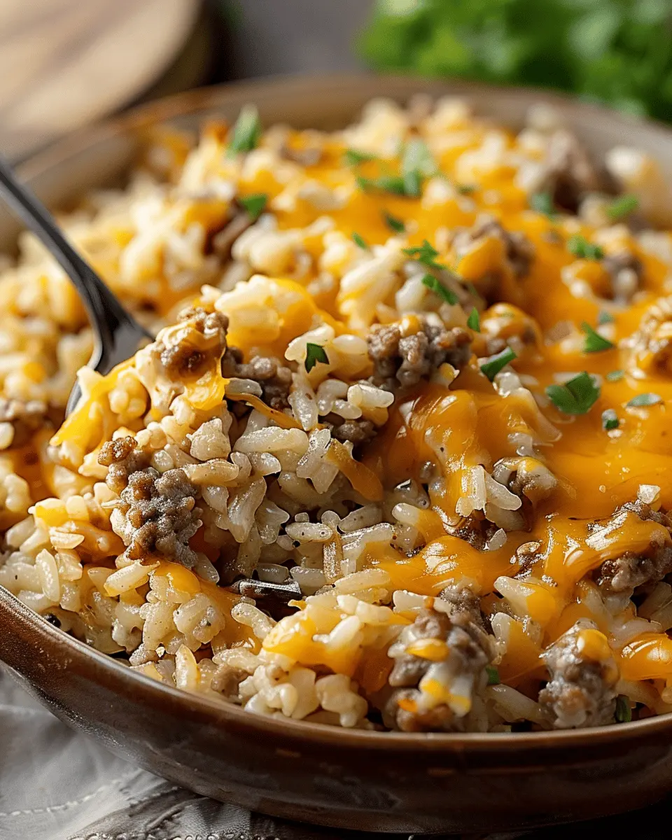 PrintCheesy Hamburger Rice Casserole: Easy Comfort Food for All