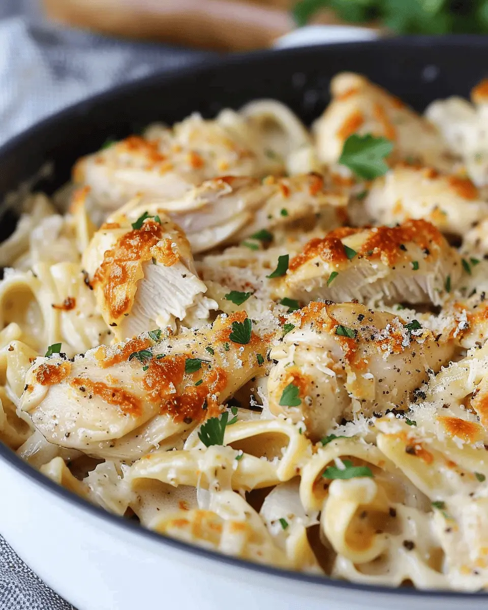Now it’s time to bring it all together! Add the drained pasta and cooked chicken back into the skillet. Gently toss everything until the pasta is coated in that luscious creamy sauce. If you find the sauce too thick, gradually add some reserved pasta water until it reaches your desired consistency.