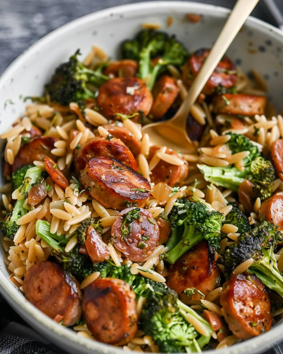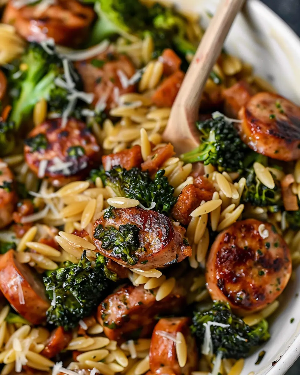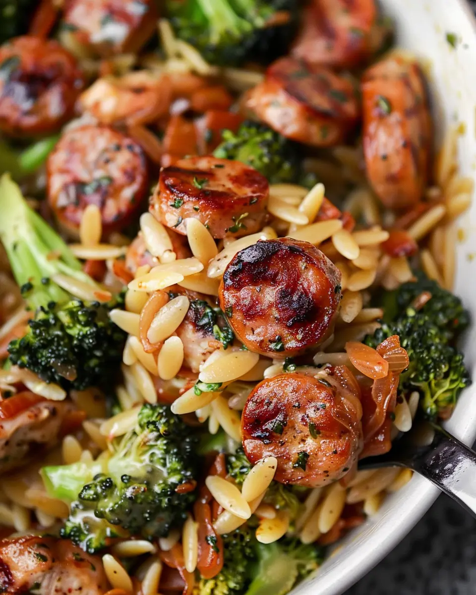 A quick and healthy recipe featuring chicken sausage and broccoli combined with orzo for a delightful meal.