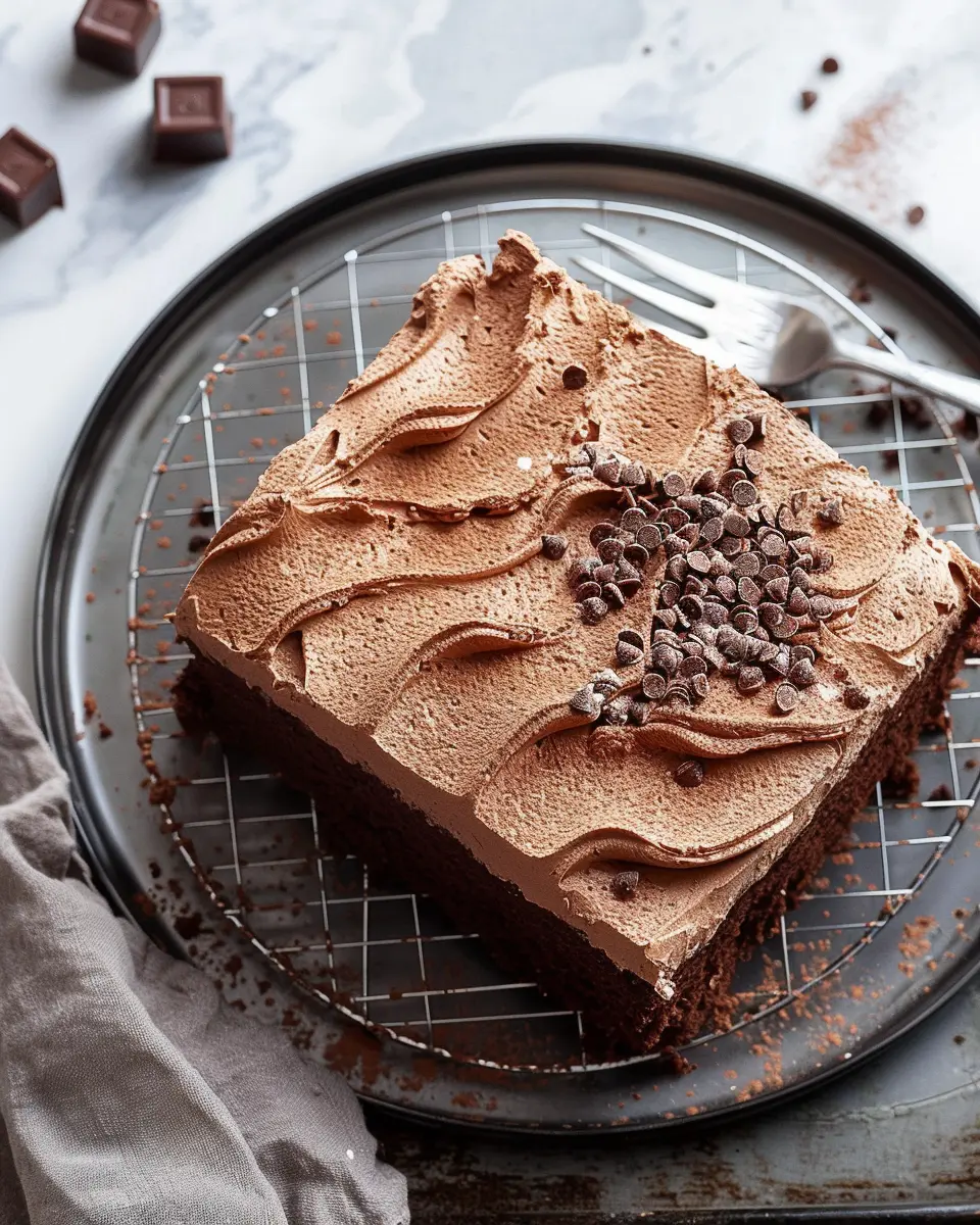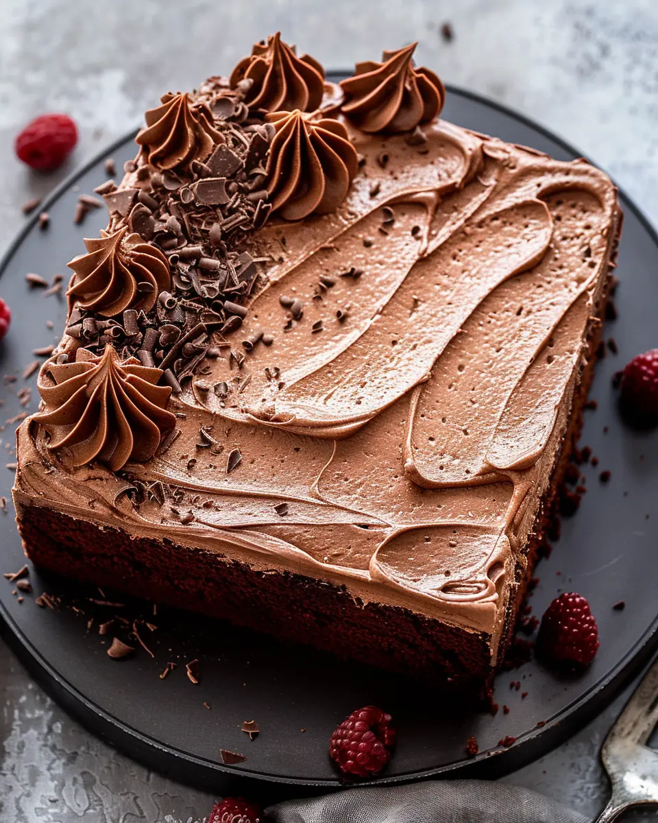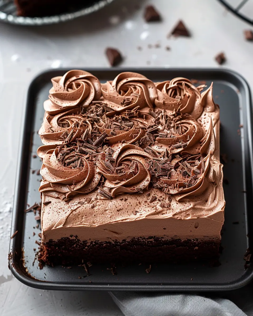 Once your cake layers have cooled, it’s time to assemble. Place one layer of the cake on a plate, spread a generous amount of chocolate mousse on top, and then gently place the second layer on top. Continue this for however many layers you desire. Once assembled, spread the remaining mousse over the top and sides of the cake, creating a smooth finish.