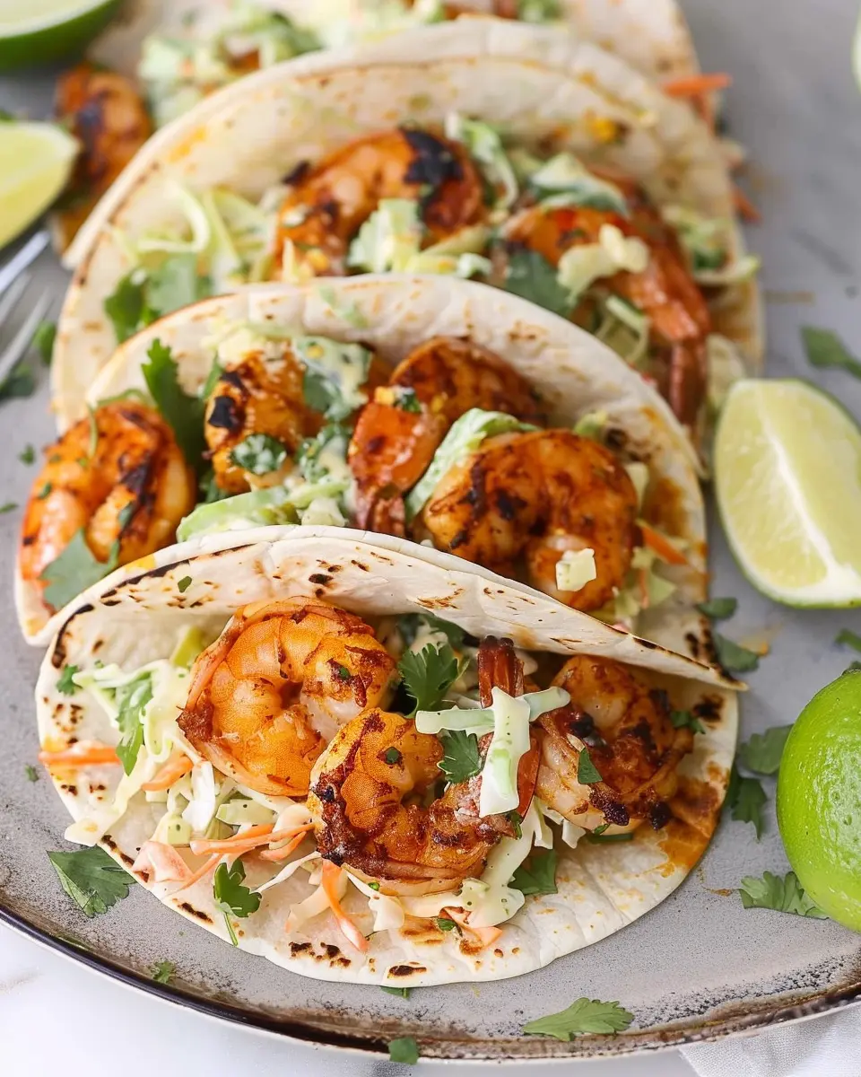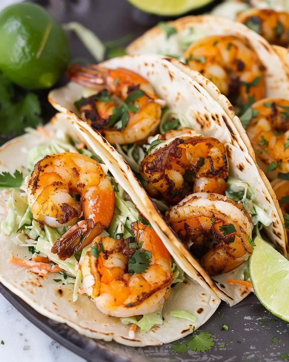 - Assemble tacos by placing shrimp and slaw on warmed tortillas.