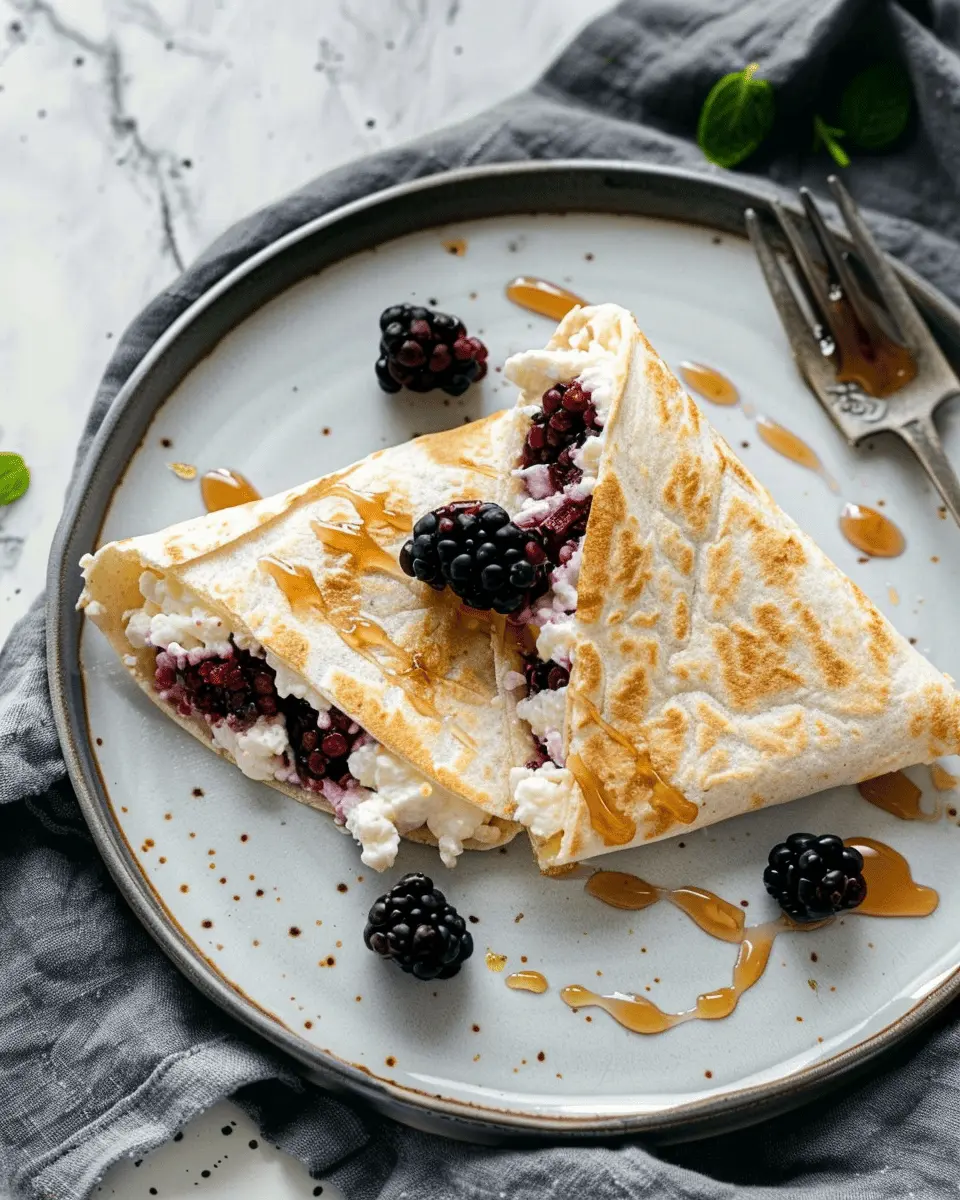 Once your Cottage Cheese & Blackberry Wrap is golden, take it off the heat and let it cool for a minute or two before slicing it in half. For a fancy touch, you can drizzle some honey or maple syrup over the top, or even a light dusting of powdered sugar if you’re feeling indulgent.