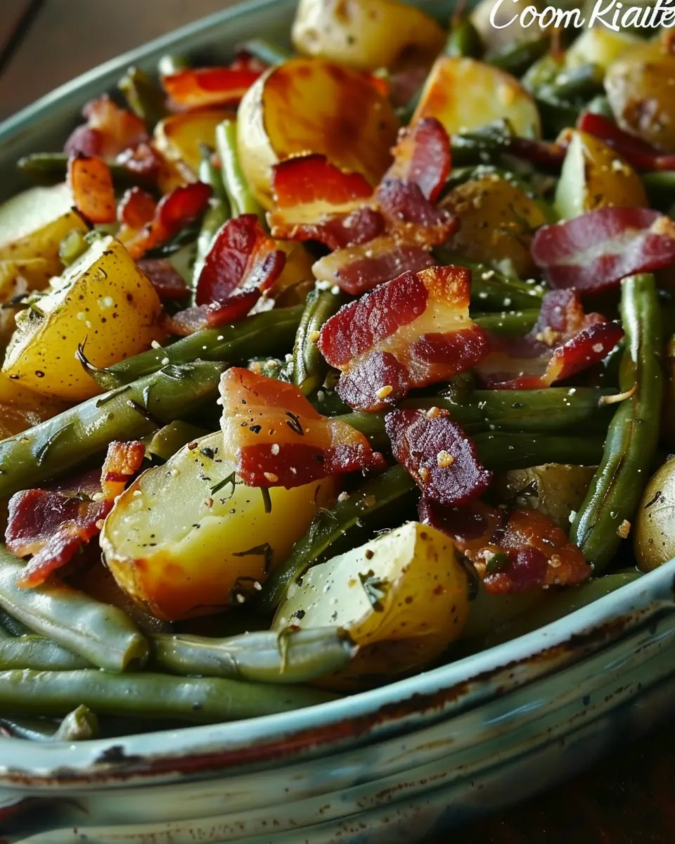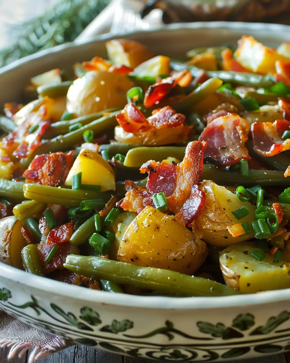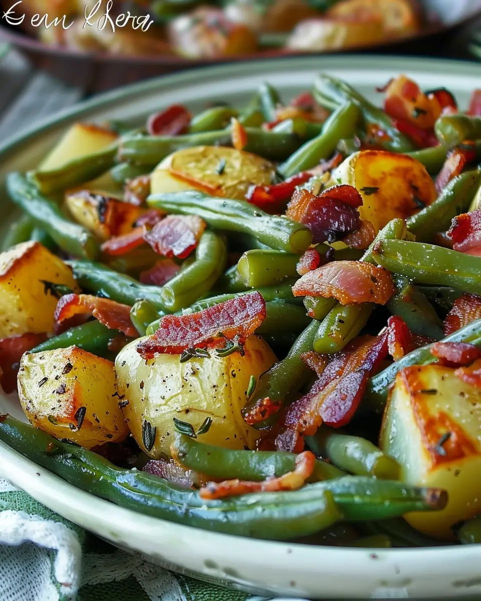 A delicious side dish featuring green beans and potatoes with the savory flavor of turkey bacon.