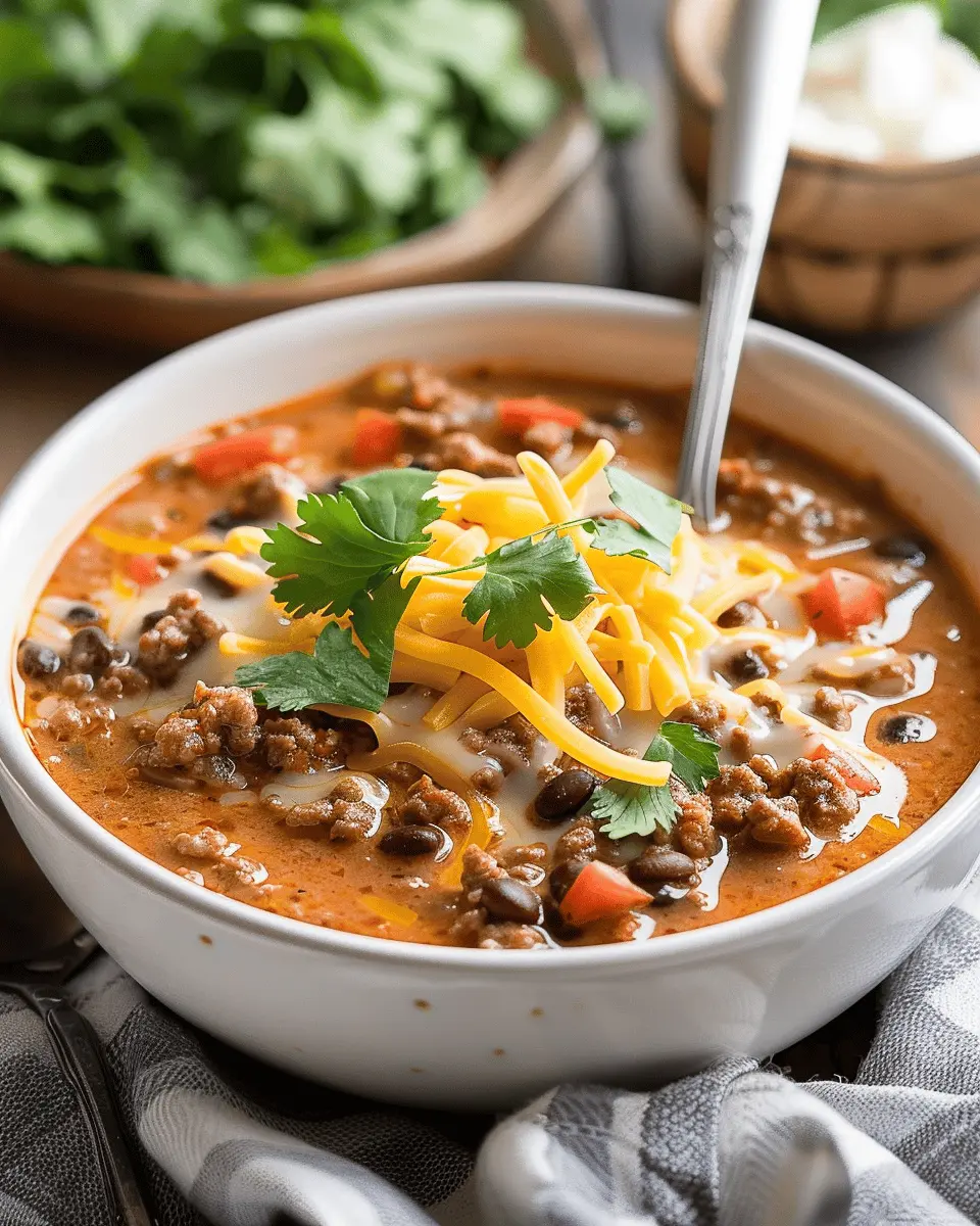 If you’re looking for a delicious vegetarian twist on the Creamy Cheesy Ground Beef Taco Soup Recipe, you’re in for a treat! Instead of ground beef, use lentils, black beans, or chickpeas for protein. You can also add a variety of diced vegetables like bell peppers, zucchini, or corn to enhance the flavor and texture. For creaminess, substitute the cheese with a rich vegan alternative or a dollop of coconut cream for that indulgent feel. This option is not just healthy but also bursting with flavor!
