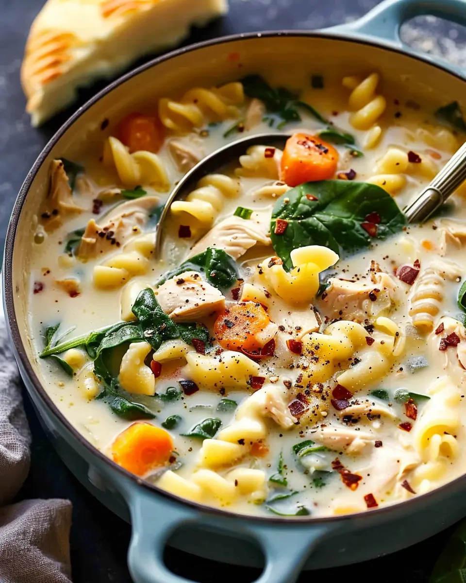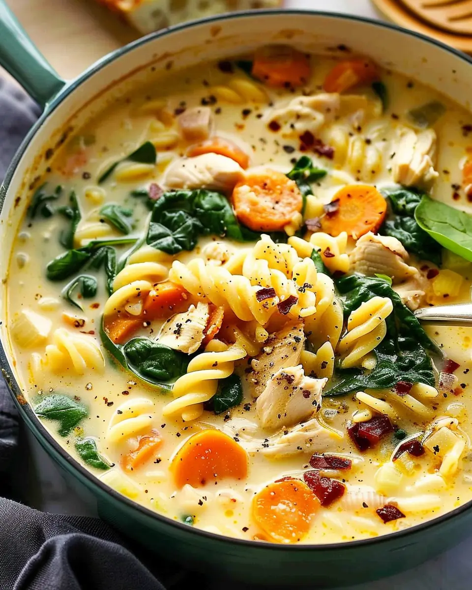 PrintCreamy Chicken Pasta Soup Recipe: Easy Comfort with Carrot & Spinach