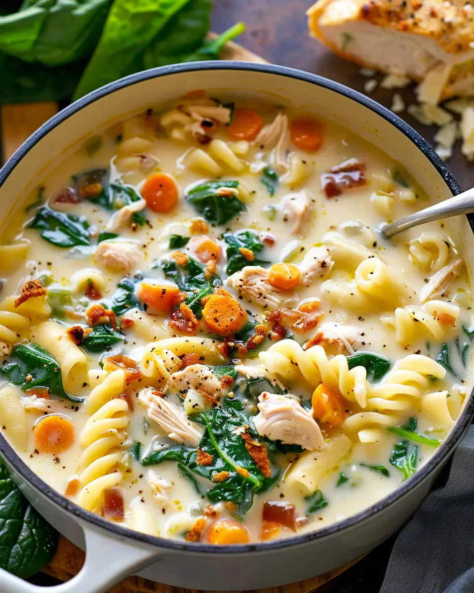 A delightful creamy chicken pasta soup enriched with carrots and spinach for a comforting meal.