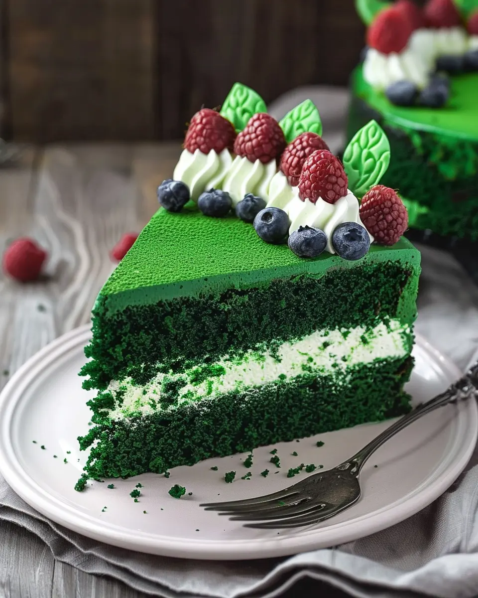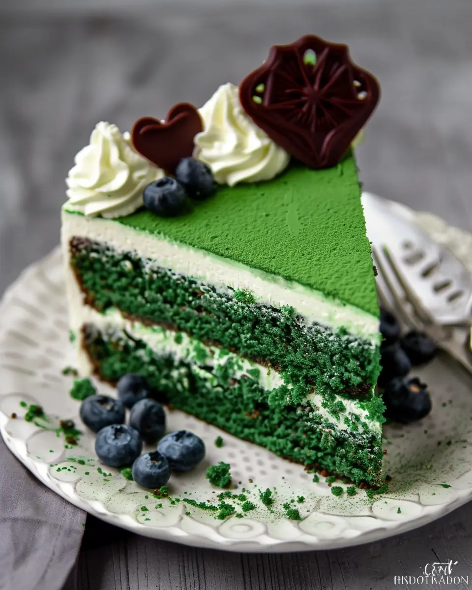 Indulge in the rich and vibrant flavor of Green Velvet Cheesecake Cake, perfect for any celebration.