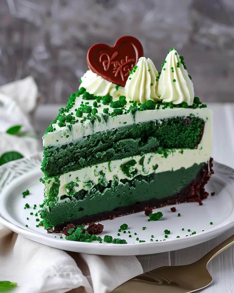 The green velvet cheesecake cake is a delightful choice for many celebrations! Its vibrant color and creamy layers make it an eye-catching centerpiece for events like St. Patrick’s Day, birthday parties, or even a cozy holiday gathering. Imagine serving this cake at a spring brunch—its festive hues evoke freshness and renewal, making every guest feel special.
