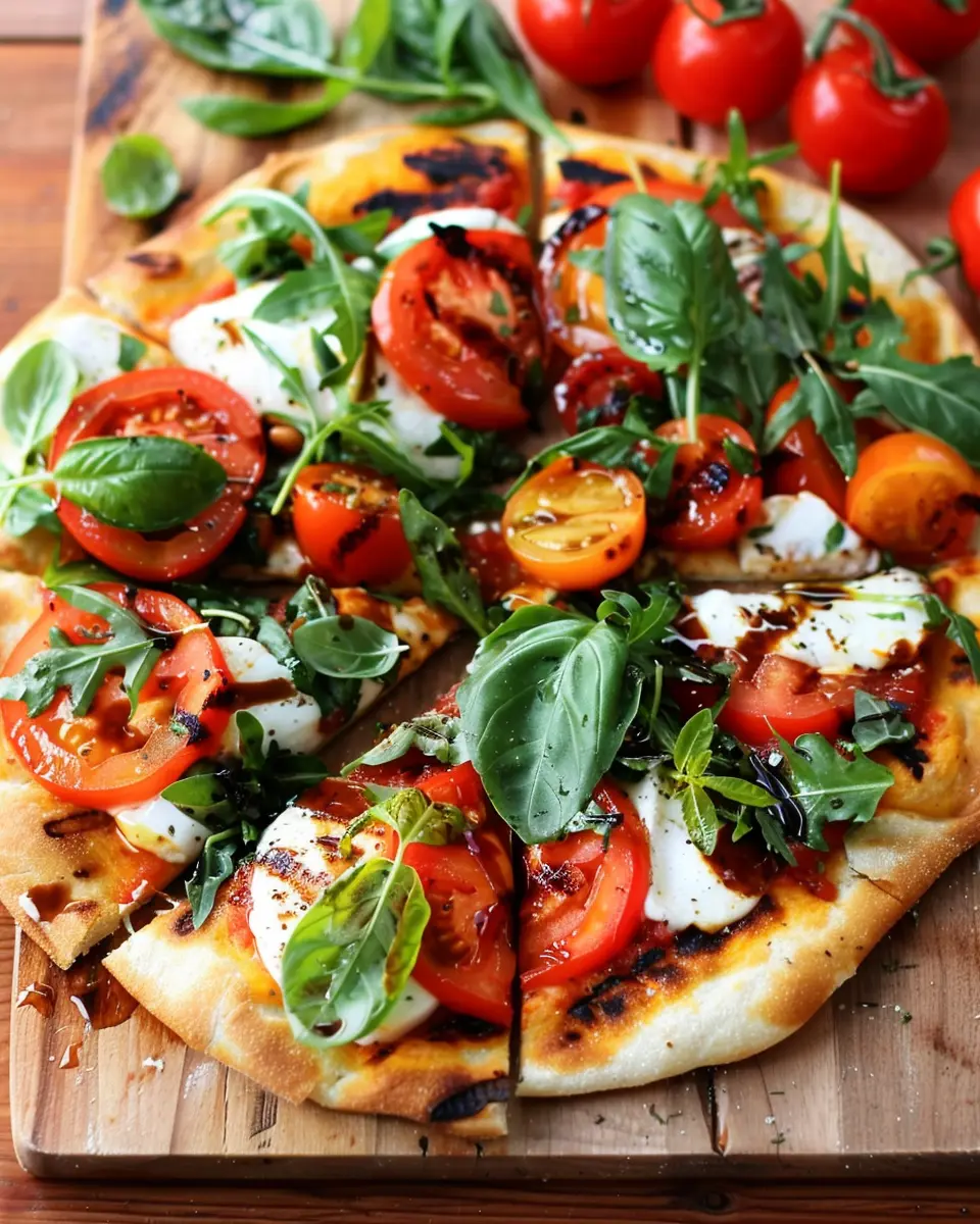 Once your pizza is beautifully grilled and the cheese is perfectly melted, it’s time for the magic touch. Remove it from the grill and layer on the fresh basil leaves and arugula mixture. Finish off with a drizzle of balsamic glaze for a hint of sweetness that complements the tart tomatoes and creamy mozzarella.