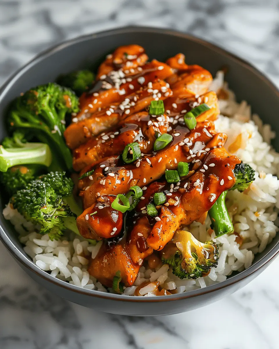 Now comes the fun part—assembling your meal! In a bowl, start with a scoop of that fluffy brown rice, followed by a generous portion of the sticky chicken and a scoop of steamy broccoli. Sprinkle sesame seeds or chopped green onions on top for a nice finishing touch.
