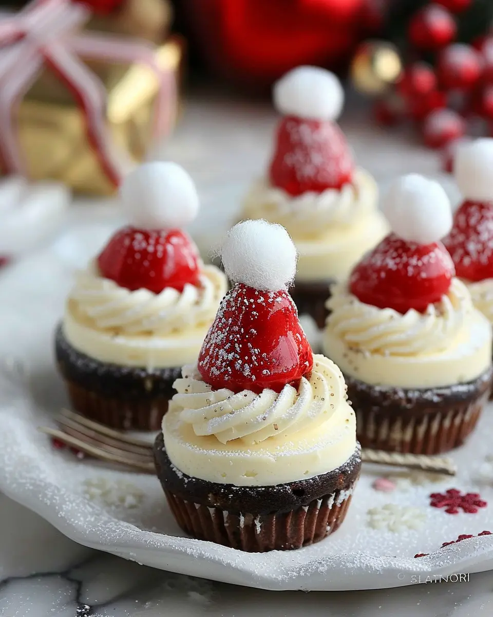 When it comes to mini Santa hat cheesecakes, presentation is everything! Start by placing them on a festive platter with a sprinkle of powdered sugar for that snowy effect. You can add fresh strawberries or raspberries around the cheesecakes for a pop of color and a tart contrast to the sweetness. Consider using peppermint sticks or small candy canes as garnish, which not only enhances the holiday spirit but also adds a fun touch that guests will love. A drizzle of chocolate sauce can provide an extra layer of decadence, impressing your guests even before they take their first bite.