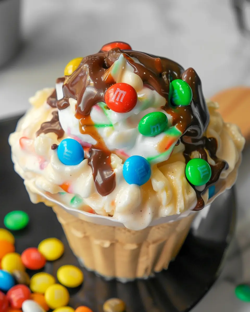 • M&M’s: About ½ cup of classic or peanut M&M’s, chopped into smaller pieces to enhance every scoop with that signature chocolatey crunch.