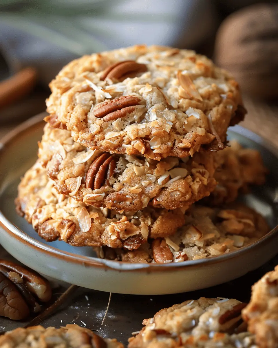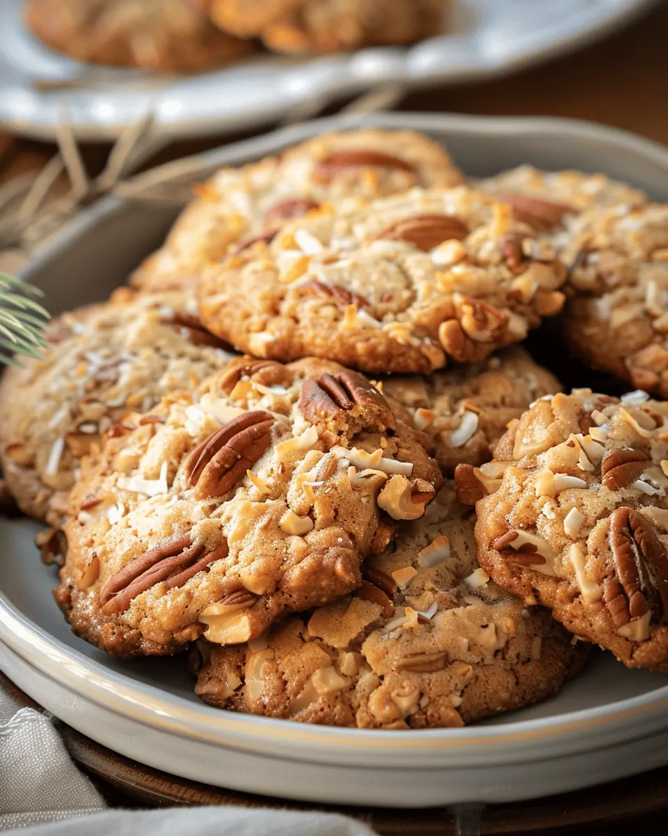 Serve your coconut pecan cookies on a stylish platter with a sprinkle of shredded coconut and crushed pecans on top for a lovely visual touch. It’s a small detail that can make your dessert feel a bit more special.