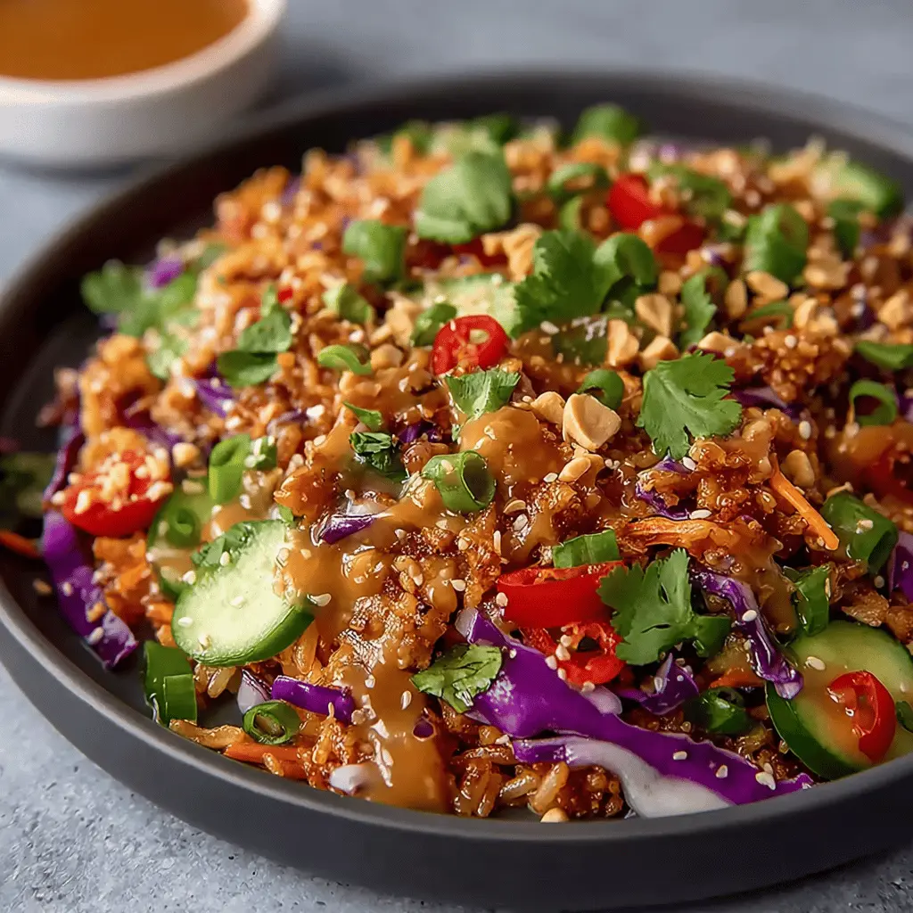 The quick crispy rice salad is not just a meal; it’s a delightful experience that combines fresh ingredients with an irresistible peanut sesame dressing. With its crunchy texture and vibrant flavors, this dish is both nourishing and satisfying—a perfect choice for busy young professionals. Packed with protein from the turkey bacon and chicken ham, this salad will keep you energized throughout your hectic day. Plus, it’s versatile—feel free to toss in whatever vegetables you have on hand!
