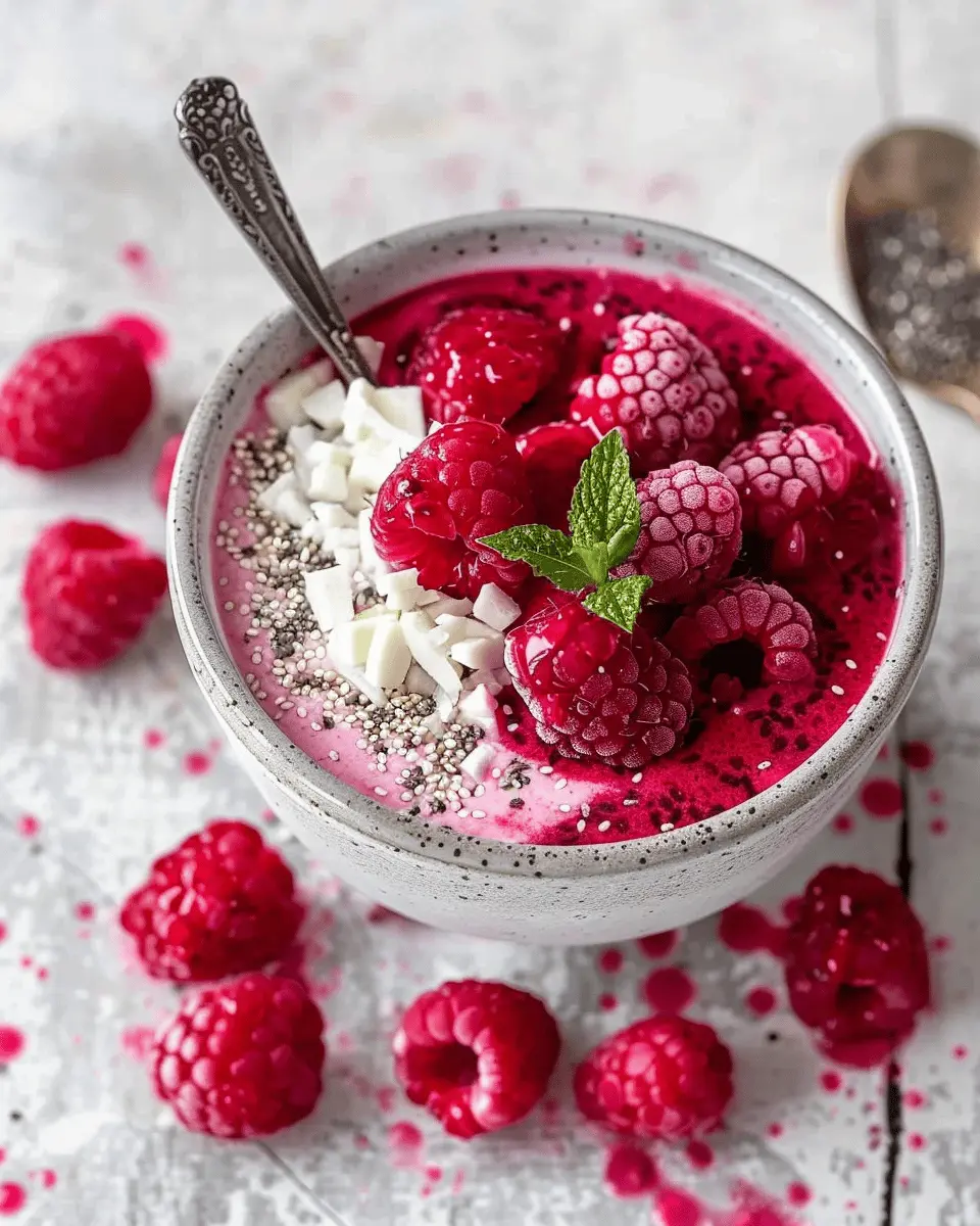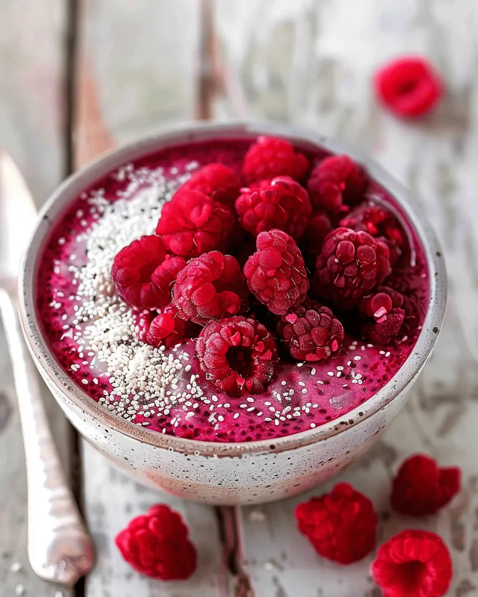 To round out your meal, pair your raspberry chia pudding with a protein-rich breakfast. Consider serving it alongside scrambled eggs or a breakfast bowl topped with sautéed turkey bacon and spinach. For a refreshing drink, a glass of freshly squeezed orange juice or a fruity smoothie blends perfectly with the tangy sweetness of the pudding.