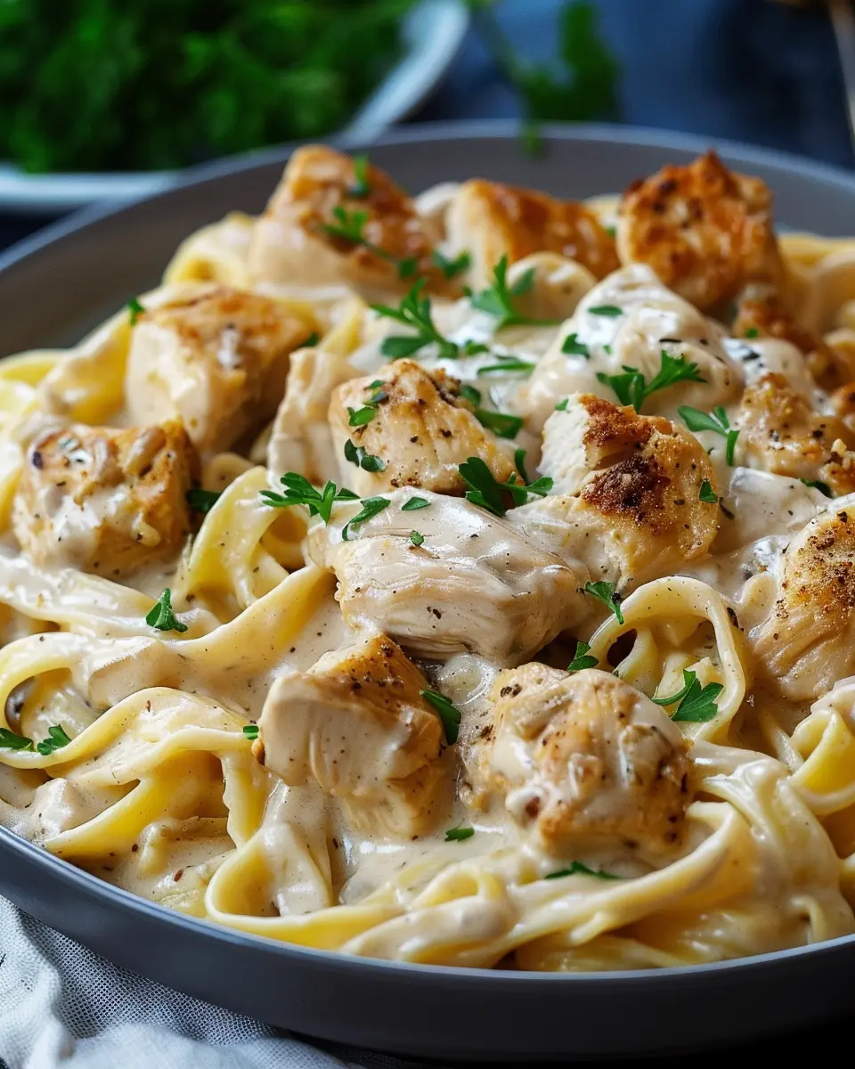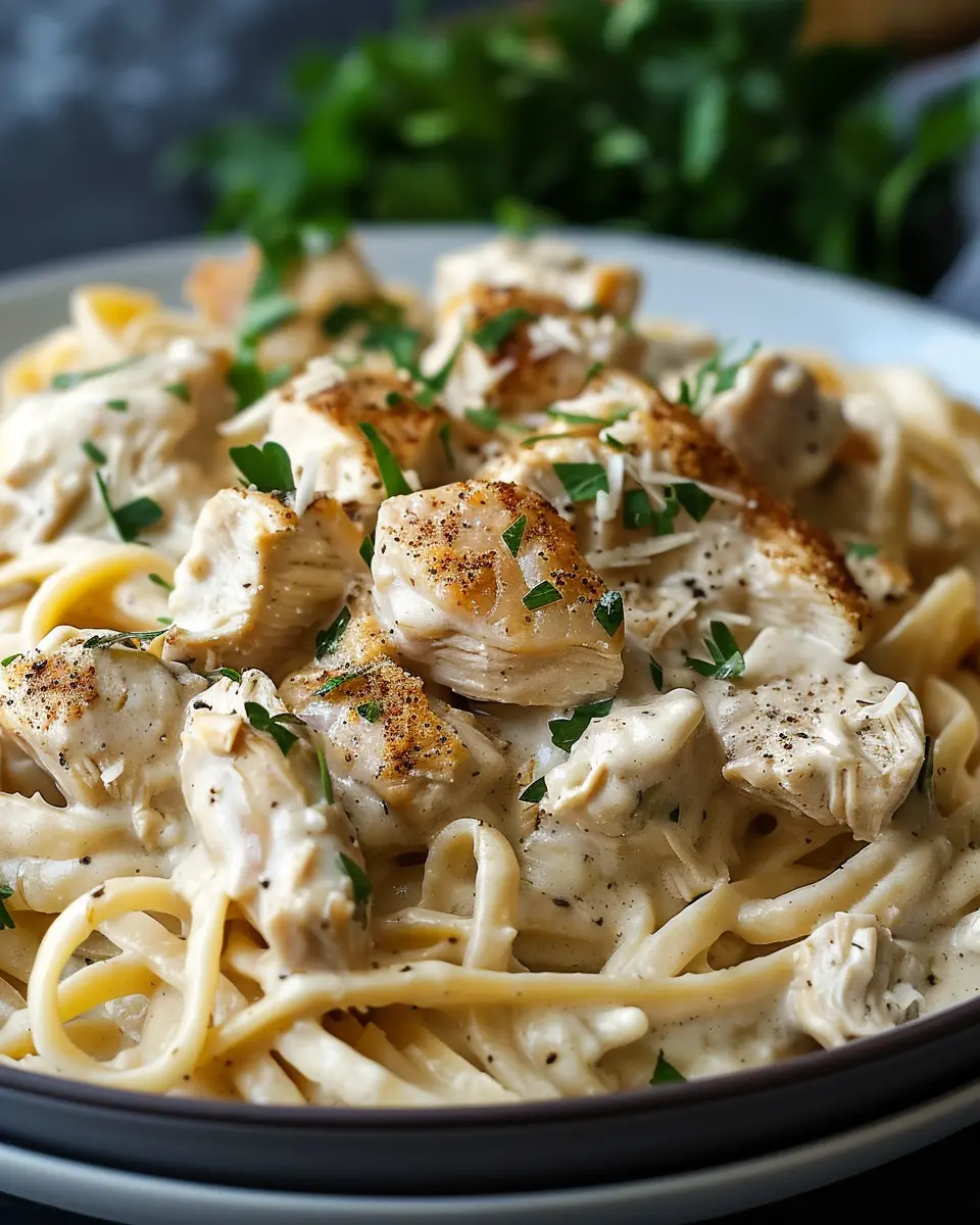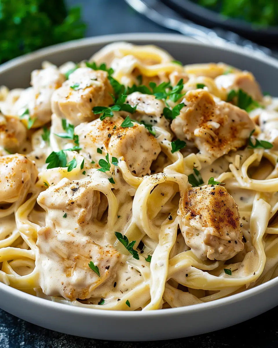 - Combine the fettuccine with the chicken mixture and serve hot.