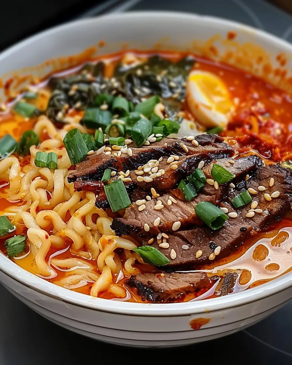 A delicious recipe for Spicy Korean Ramen featuring grilled beef and a creamy sauce that will tantalize your taste buds.