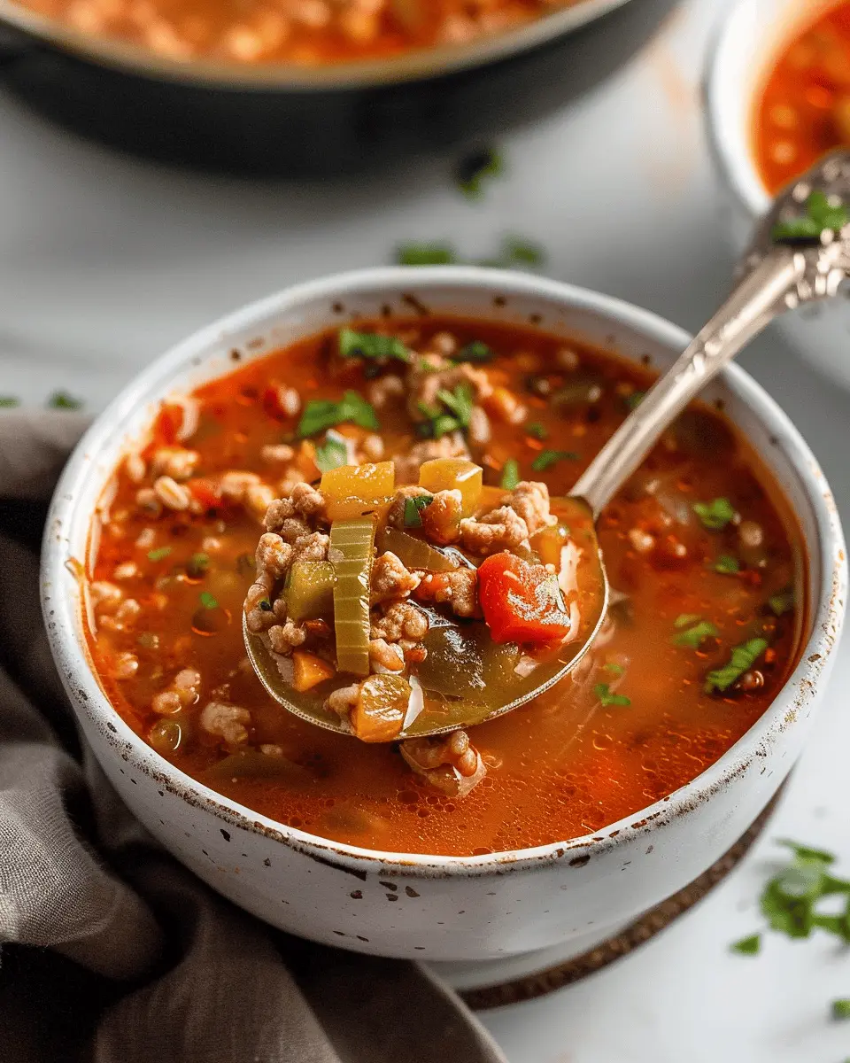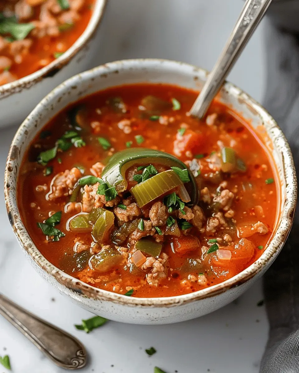 Stuffed green pepper soup is inspired by the classic stuffed bell pepper dish but presented in a comforting, broth-filled version. The base often includes vibrant green bell peppers, ground beef, rice, and a tomato broth spiced just right. A sprinkle of herbs elevates the flavors, while the savory notes make it irresistible. You might ask, “What makes this soup such a great option for me?” Well, here’s why: