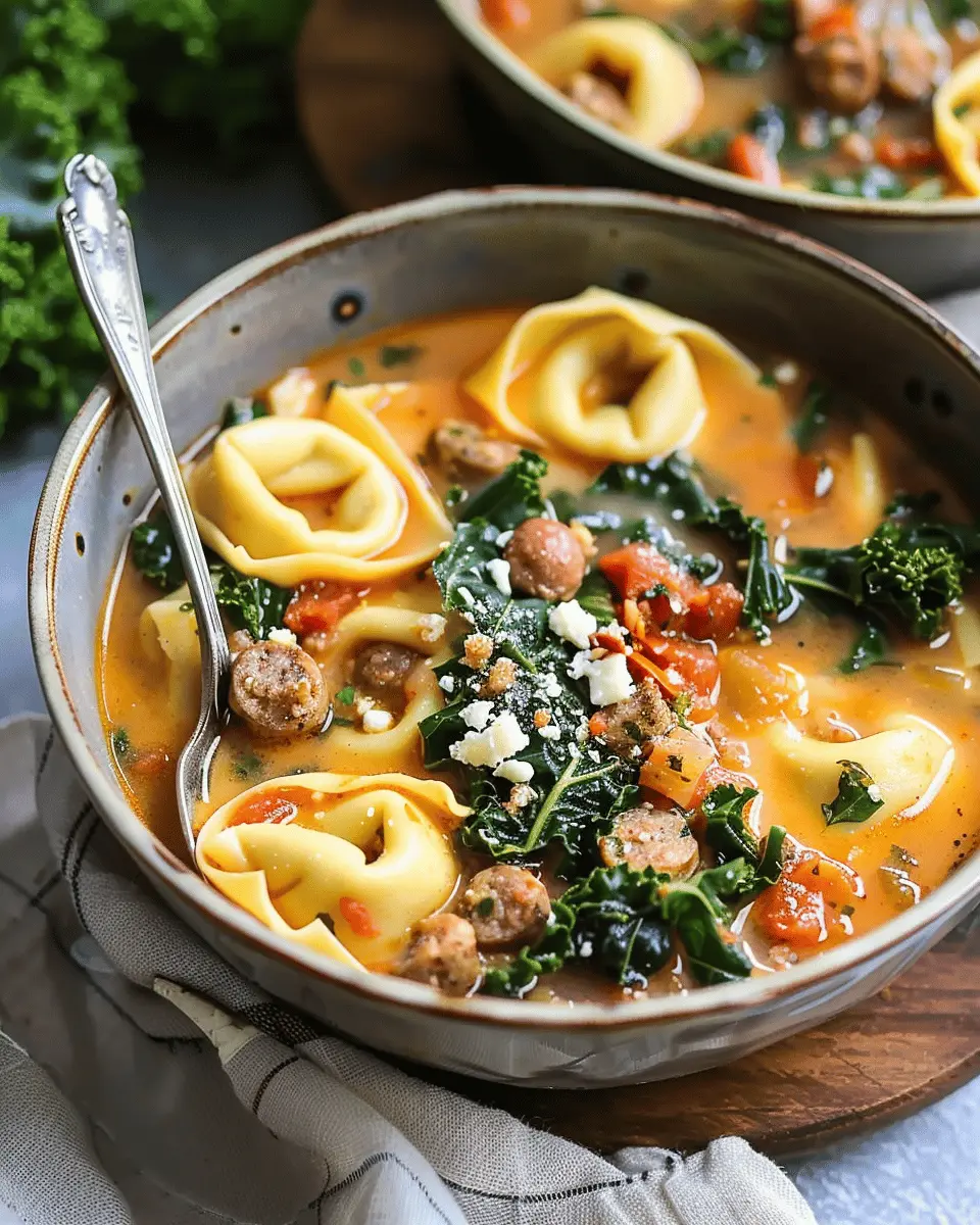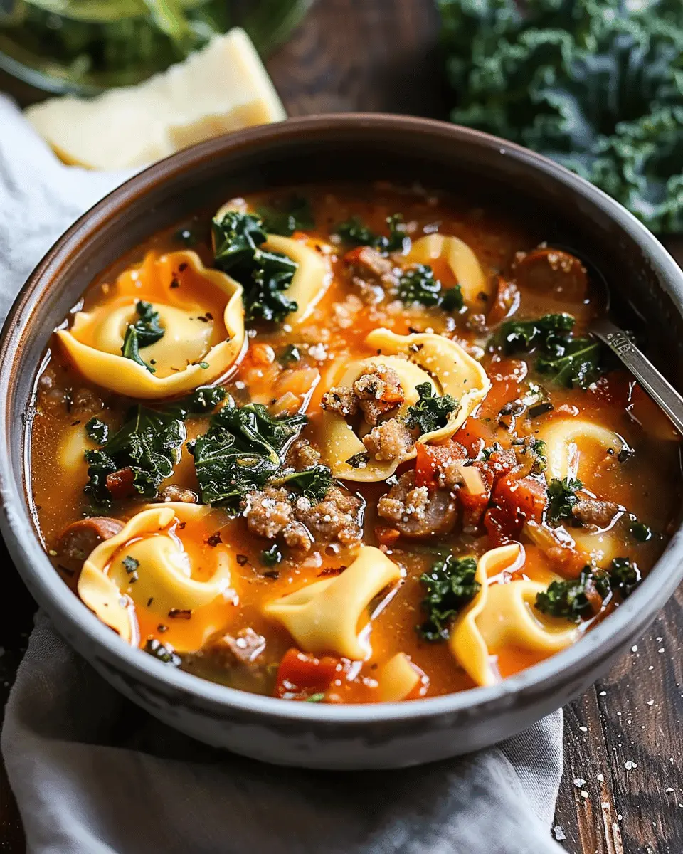 A warm and hearty tortellini soup featuring flavorful Italian sausage and nutritious kale.